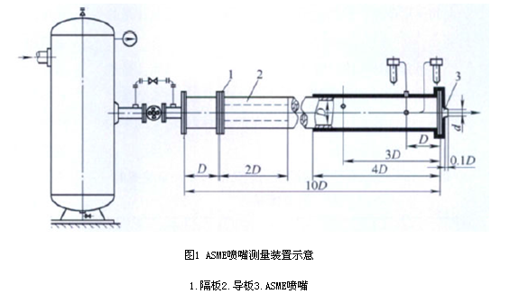 常用的节流测量装置有:ASME喷嘴测量装置、ISA1932喷嘴测量装置、孔板测量装置和文丘里喷嘴测量装置。其中ASME喷嘴和ISA1932喷嘴测量装置的气体流出系数值较大,精度也较高,使用也较多。ASME喷嘴测量装置由于气体通常直接排空,且要求测量喷嘴压差的压差计量程较小,因此测量大流量时,该装置的尺寸也比较大,不便于移动测量,如图1所示。