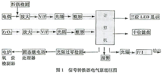 将来自氧量检测器的模拟信号(氧势、热电势)分别调制成0-10KNz调频信号,经光电隔离后送至计算机,采用调频方式能将仪表输入、输出相互隔离,这样就消除了诸如大电流跳变所引起的干扰,能够克服高共模电压,因而大大提高了仪表的抗干扰能力。应用程序主要由主程序和子程序组成,所有的程序都采用??榻峁贡嘀?,便于修改、增加软件功能,以满足不同用户的特殊需要。程序运算采用了三位浮点数,保证了运算劳动精度,对氧浓、炉温的计算,采用查表线性插值法,对炉温的控制采用增量式PID算式控制。信号转换器的电气原理框图见图1