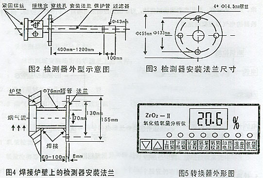 氧量检测器由防尘装置、氧化锆管、加热电炉、测温热电偶、接线盒以及壳体等主要部件组成。整个装置采用全封闭型结构,以增加整个装置的密封性能,提高使用寿命。