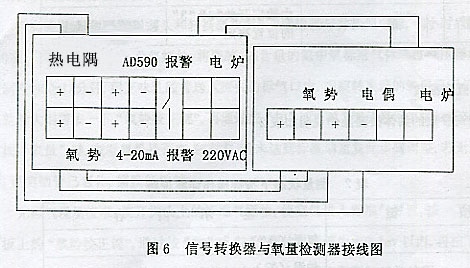 信号转换器盘装于控制室,氧量检测器安装于现场,它们之间连接线有:氧势信号线两根采用RVVP2×1.5带屏蔽二芯电缆线敷设、电偶冷端补偿导线两根,采用K分度KX-G型2×1.5带屏蔽二芯补偿导线敷设、电炉加热线两根,采用RVVP2×2.5二芯电缆线敷设。 信号转换器与氧量检测器之间的接线见图3。