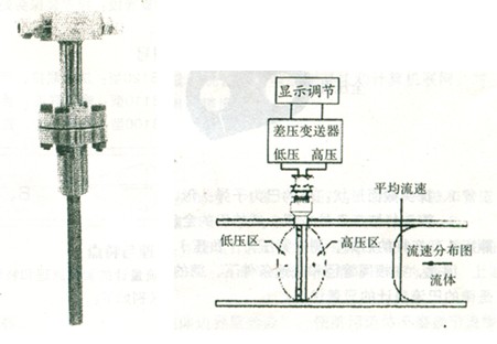 威力巴流量计是一种插入式流量测量仪表。在管道中插入一根威力巴传感器 ,传感器在高、低压区有按一定规则排列的多对 一般为三对取压孔。分别测量流体的全压力包括静压力和平均速度压力Pl和静压力P2。将P1和P2 分别引入差压变送器 , 测量出差压 △P=P1-P2, △P反映流体平均速度的大小 , 以此可推算出流体的流量。