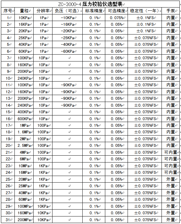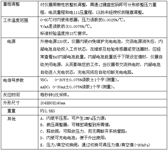ZC-3000-4压力校验仪测量压力精度为±0.1%-±0.05%。在测试过程中校验仪为传感器或变送器提供24V回路电源,并测量它们的输出值。仪器在微处理机的控制下提供了许多优点,如:测量压力单位的转换,测量电参数的转换,文件菜单内多种数据的设定,被检传感器或变送器的数据记录、查询等。同时仪器的可靠性和适用性大大提高,微处理器所包含的软件完成了传感器线性化和失调校正,并通过键盘对仪器进行精确校验操作。