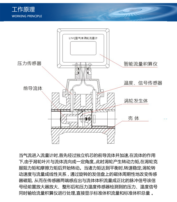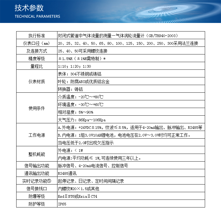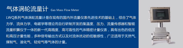 LK-LWGQ系列智能一体化气体涡轮流量计是采用先进的超低功耗单片微机技术研制的涡轮流量传感器与显示积算一体化的新型智能仪表,采用双排液晶现场显示,具有机构紧凑、读数直观清晰、可靠性高、不受外界电源干扰、抗雷击、成本低等明显优点。仪表具备仪表系数三点修正,智能补偿仪表系数非线性,并可进行现场修正。高清晰液晶显示器同时显示瞬时流量(4位有效数字)及累积流量(8位有效数字,带清零功能)。所有有效数据掉电后保持10年不丢。该类涡轮流量计均为防爆产品,防爆等级为:ExdIIBT6。