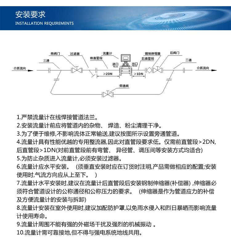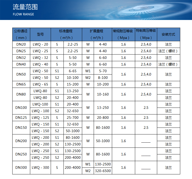 注:用户在选型时,应根据管道公称压力、介质最高压力、介质温度、介质组分情况、流量范围及信号输出要求合理选择流量计的型号规格。为使流量计的使用性能,流量计的使用流量范围应在(20%~80%)Qmax范围内比较合适。