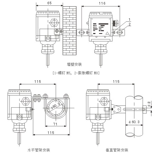 LK-LC/LR型投入式液位计变送器具有多种安装固定方式,以适应不同现场情况。当现场不能够提供G2的内螺纹或法兰等工艺设施时,可选择普通形式的液位变送器,它有墙壁安装式、水平管架式和垂直管架式等叁种安装方式可选择,使您在现场安装时得心应手。