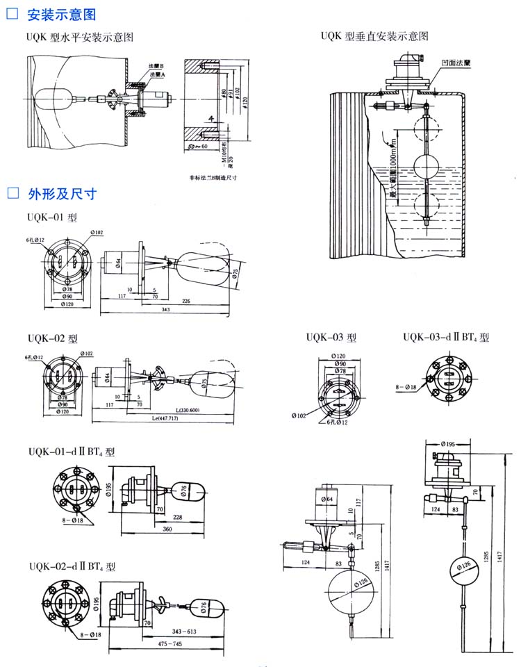 UQK-01、UQK-02、UQK-03型浮球液位控制器适用于对各种容器内液体的液体控制,当液位到达上、下切换值时,控制器触点发出通断开关式信号。产品系列分防爆或非防爆两大类,防爆型能用于易燃和易 爆介质为1.2级及A、B、C组承压容器的液位控制??刂破鞑皇视糜诙曰仆⒉恍飧值炔牧嫌薪锨扛醋饔靡约昂械即旁又实慕橹?。